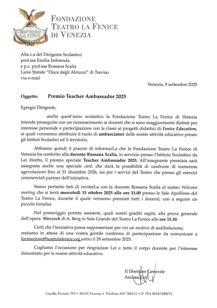 Il 15 ottobre 2025, presso il Teatro La Fenice di Venezia, è stato conferito alla prof.ssa Rossana Scalia il premio speciale Teacher Ambassador 2025.